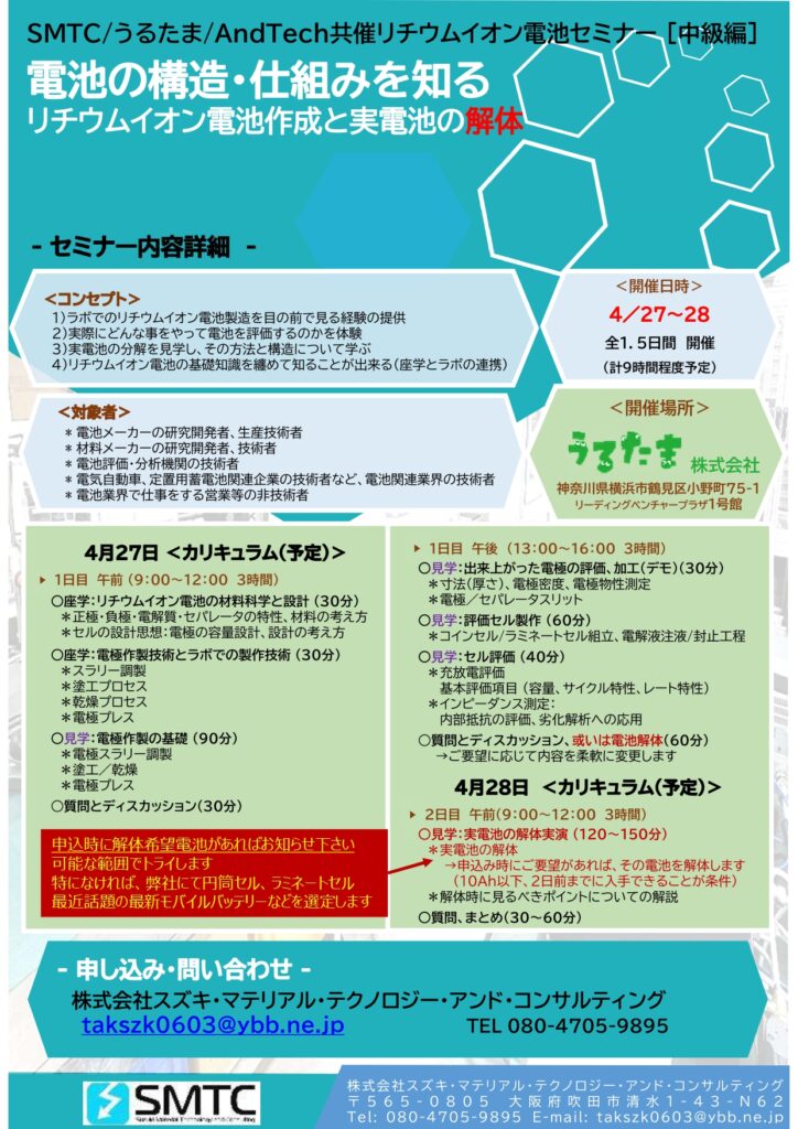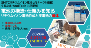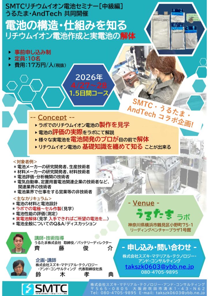4/27~28 【電池作成・解体】SMTC, うるたま, AndTechコラボセミナー 2026年3月13日 最終更新日時 : 2026年3月13日 takanori.suzuki ▼申し込みフォームはパンフレットの下へ ↓ ご希望のセミナー 4月27~28日 電池セミナー「解体」(中級)* お名前(必須) 社名(もしくは所属)(必須) 部署名 タイトル(職位) メールアドレス(必須) 電話番号 お問い合わせ・ご希望・メッセージ